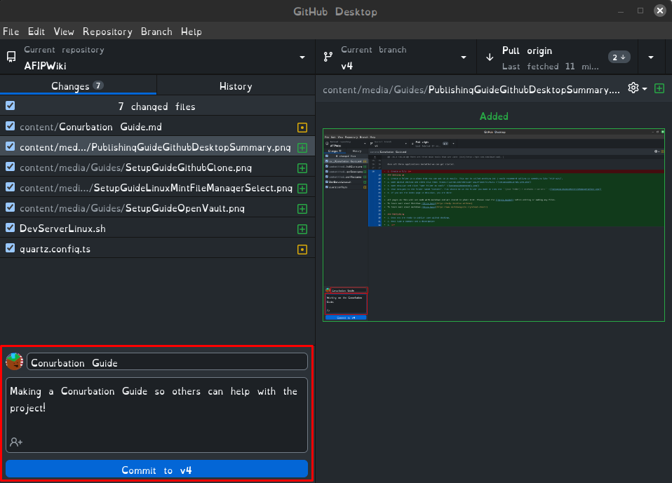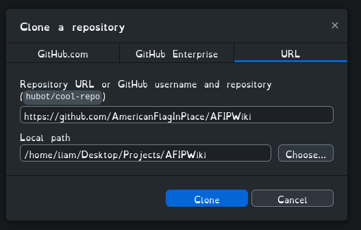 - Open Github Deskop and Clone this Repository https://github.com/AmericanFlagInPlace/AFIPWiki to the folder you just created.